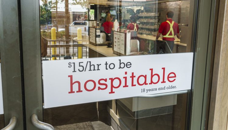 Columbia South Carolina, Chick-fil-A, fast food restaurant with sign advertising $15 an hour to be hospitable.