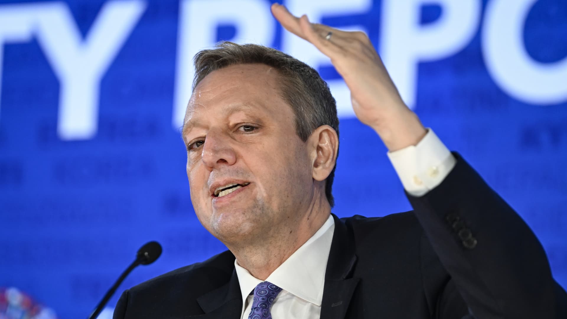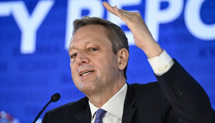 Financial Counsellor and Director of the Monetary and Capital Markets Department Tobias Adrian hold the press briefing of the Global Financial Stability Report at the International Monetary Fund during the 2024 Spring Meetings of the International Monetary Fund (IMF) and the World Bank Group in Washington DC, United States on April 16, 2024.