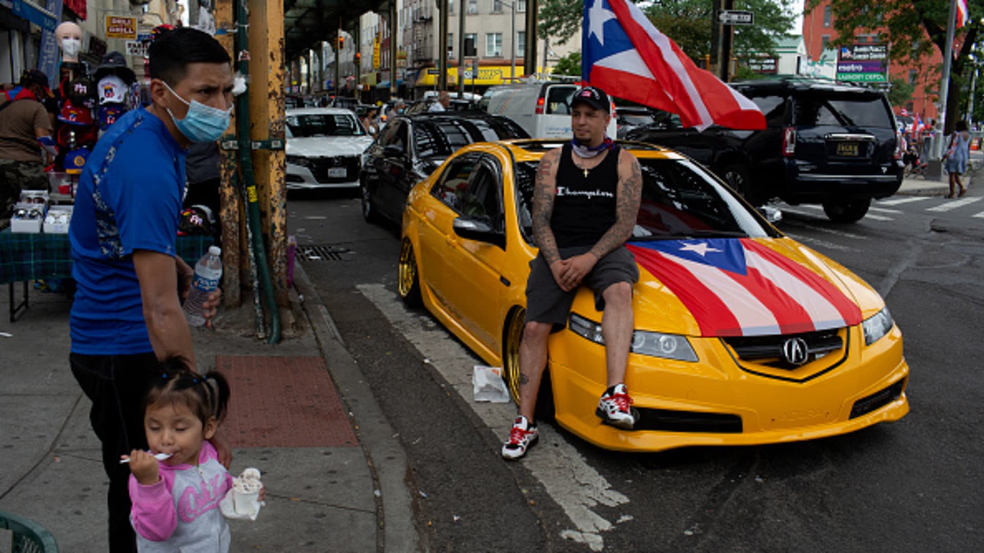 After almost a year and a half of cancelled gatherings and parades due to the COVID-19 pandemic, street life returns to normal at the Brooklyn Puerto Rico Day Parade on June 13, 2021 on Knickerbocker Avenue in the Bushwick neighborhood of Brooklyn, New York.