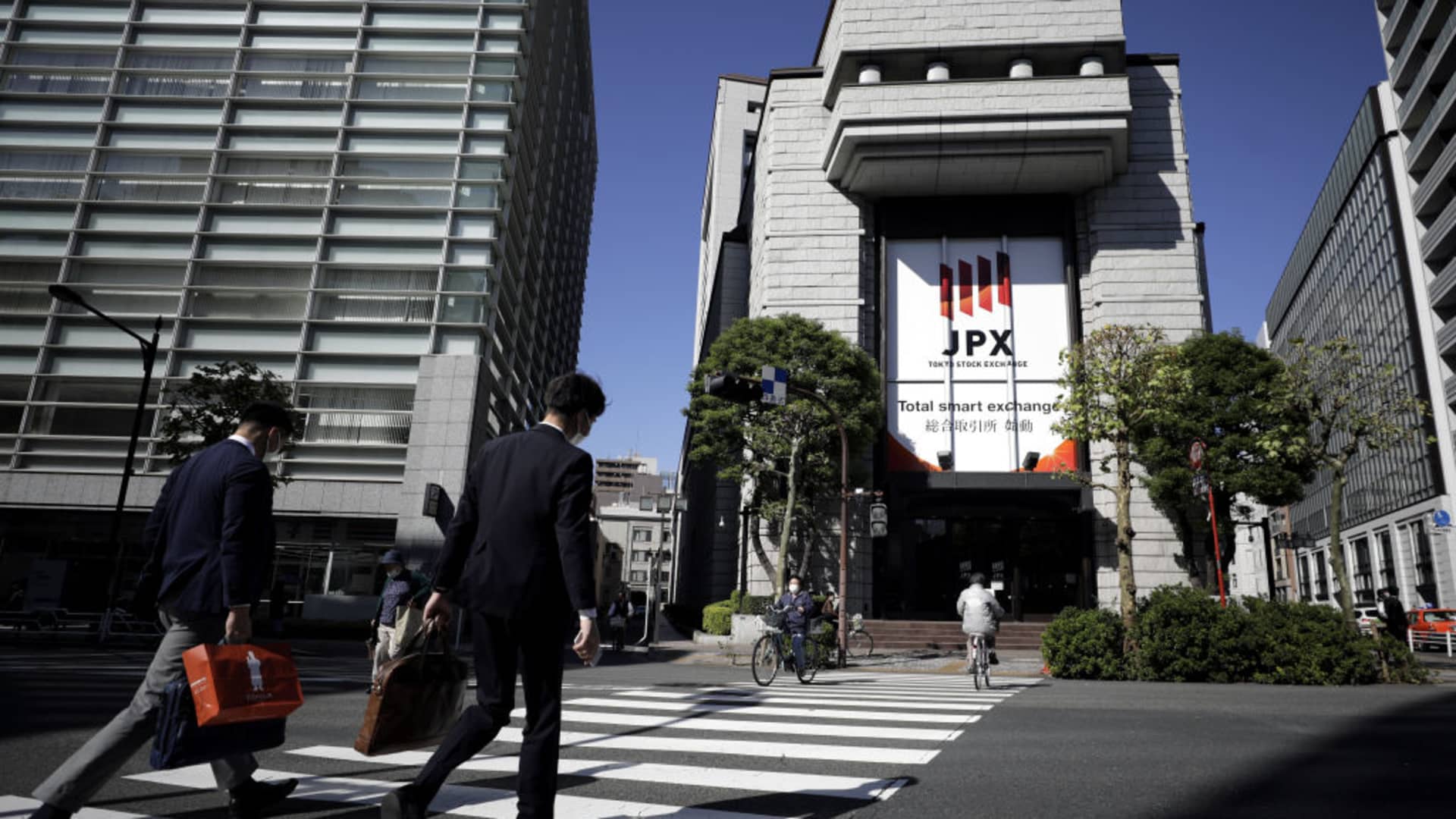 Pedestrians cross a road in front of the Tokyo Stock Exchange (TSE), operated by Japan Exchange Group Inc. (JPX), in Tokyo, Japan, on Thursday, Oct. 29, 2020.