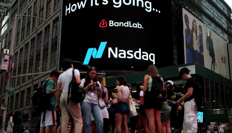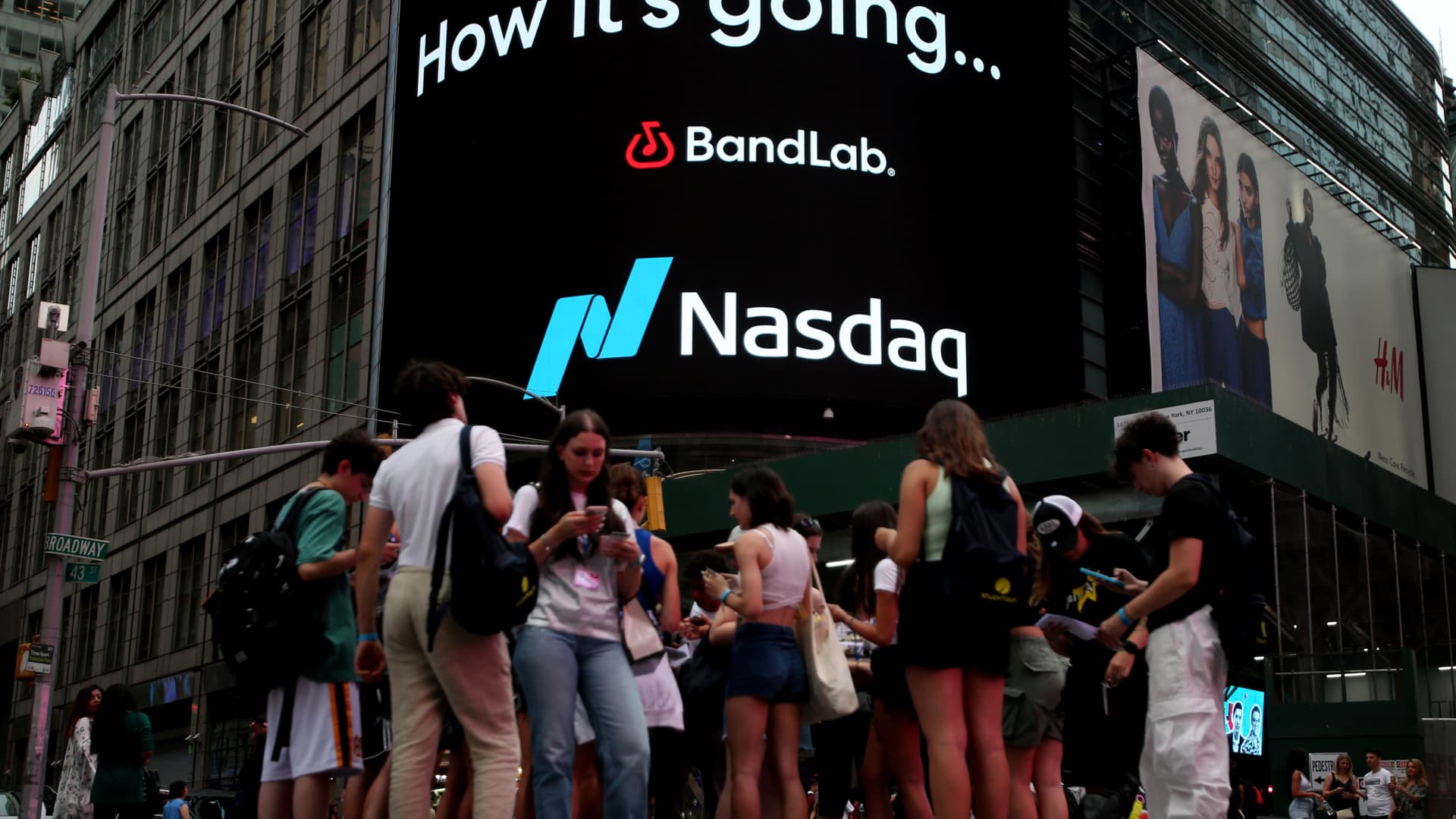 People walk near Nasdaq MarketSite at Times Square on July 12, 2023 in New York City.