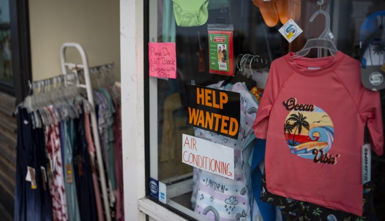A help wanted sign on a storefront in Ocean City, New Jersey, US, on Friday, Aug. 18, 2023. Surveys suggest that despite cooling inflation and jobs gains, Americans remain deeply skeptical of the president’s handling of the post-pandemic economy. Photographer: Al Drago/Bloomberg via Getty Images