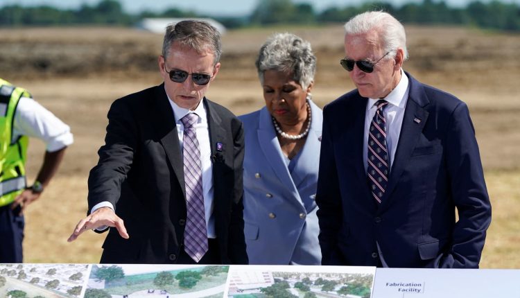 U.S. President Joe Biden listens to Intel CEO Pat Gelsinger as he attends the groundbreaking of the new Intel semiconductor manufacturing facility in New Albany, Ohio, U.S., September 9, 2022.