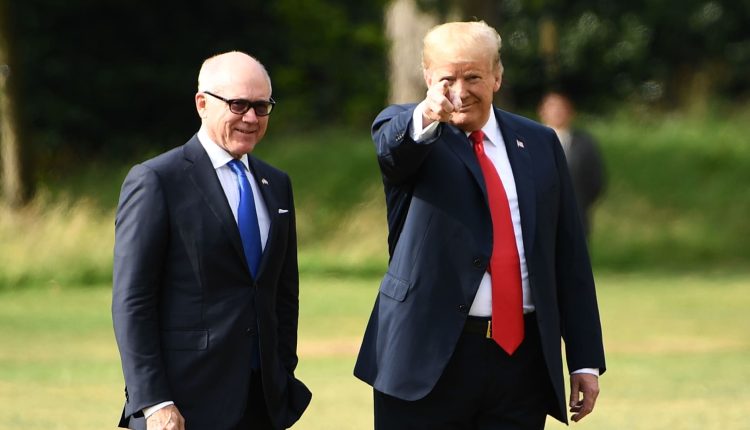 US President Donald Trump (R) gestures as he talks with US Ambassador to the United Kingdom Woody Johnson (L) preparing to board Marine One to depart the US ambassador’s residence Winfield House in London on July 13, 2018.
