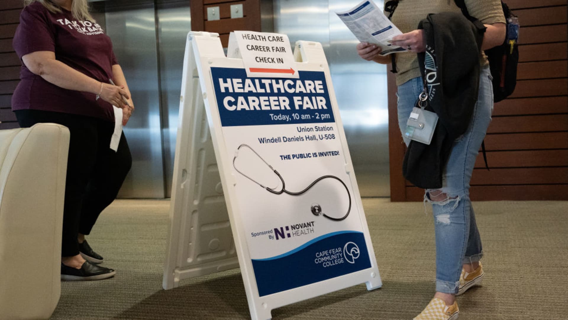 A sign for a health-care career fair at Cape Fear Community College in Wilmington, North Carolina, on Feb. 28, 2023.