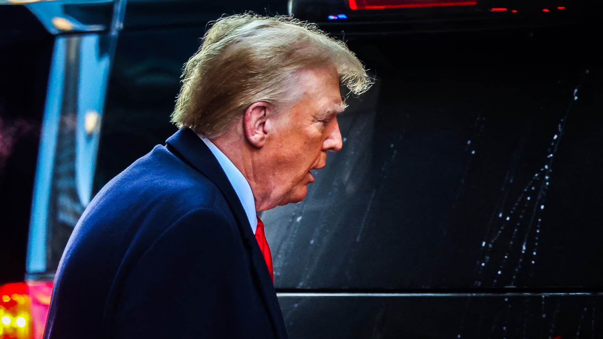 Former US President Donald Trump leaves Trump Tower for Manhattan federal court for the second defamation trial against him, in New York City on January 17, 2024.