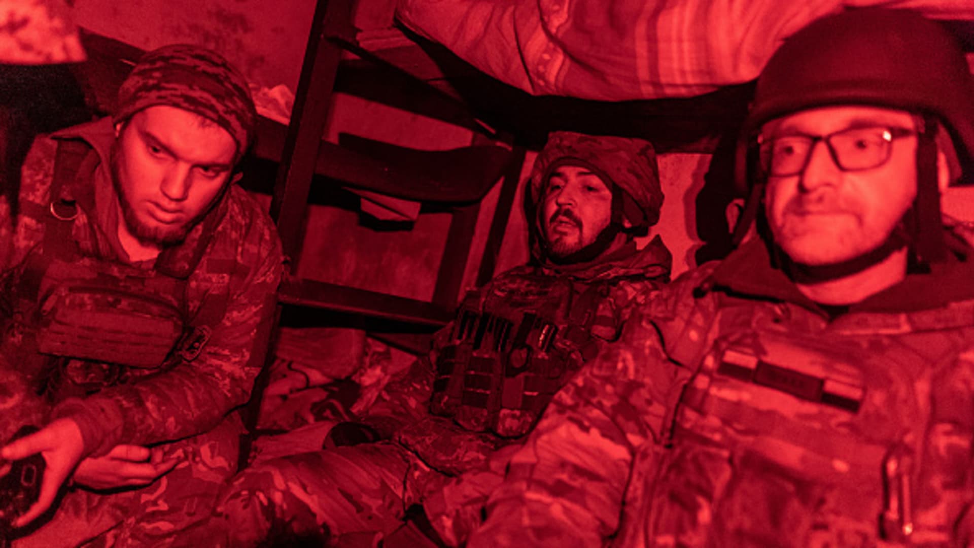 Portrait of a Ukrainian soldier against the background of an explosion over the horizon as the special unit “Achilles” is preparing to carry out a combat mission at night on the heavy drone “Vampire”, which the Russians call “Baba Yaga” on November 12, 2023 in the Bakhmut District, Ukraine.