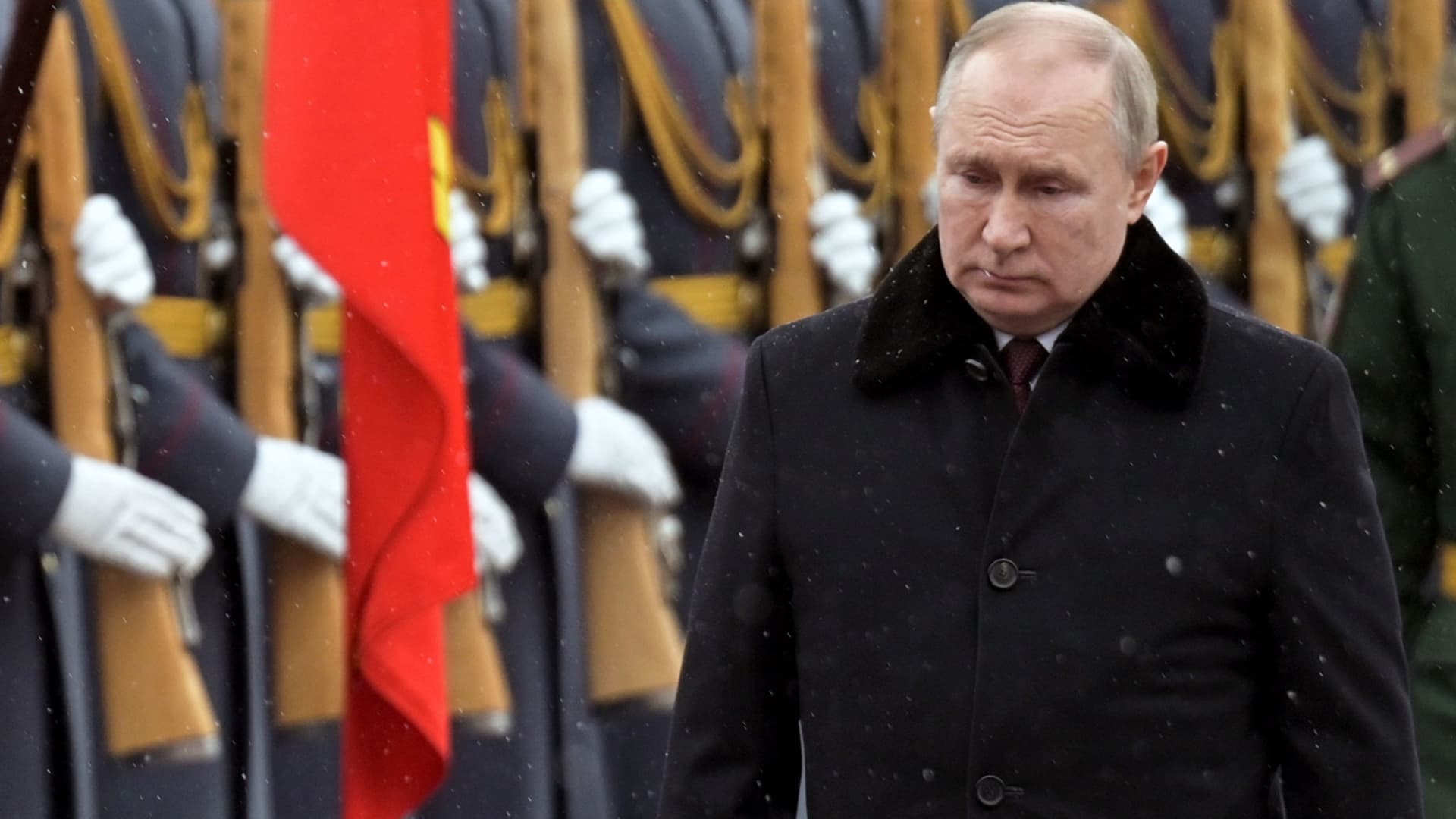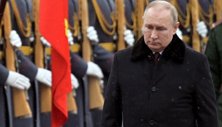 Russian President Vladimir Putin attends a wreath-laying ceremony at the Tomb of the Unknown Soldier, near the Kremlin Wall during the national celebrations of the ‘Defender of the Fatherland Day’ in Moscow, Russia, Wednesday, Feb. 23, 2022.