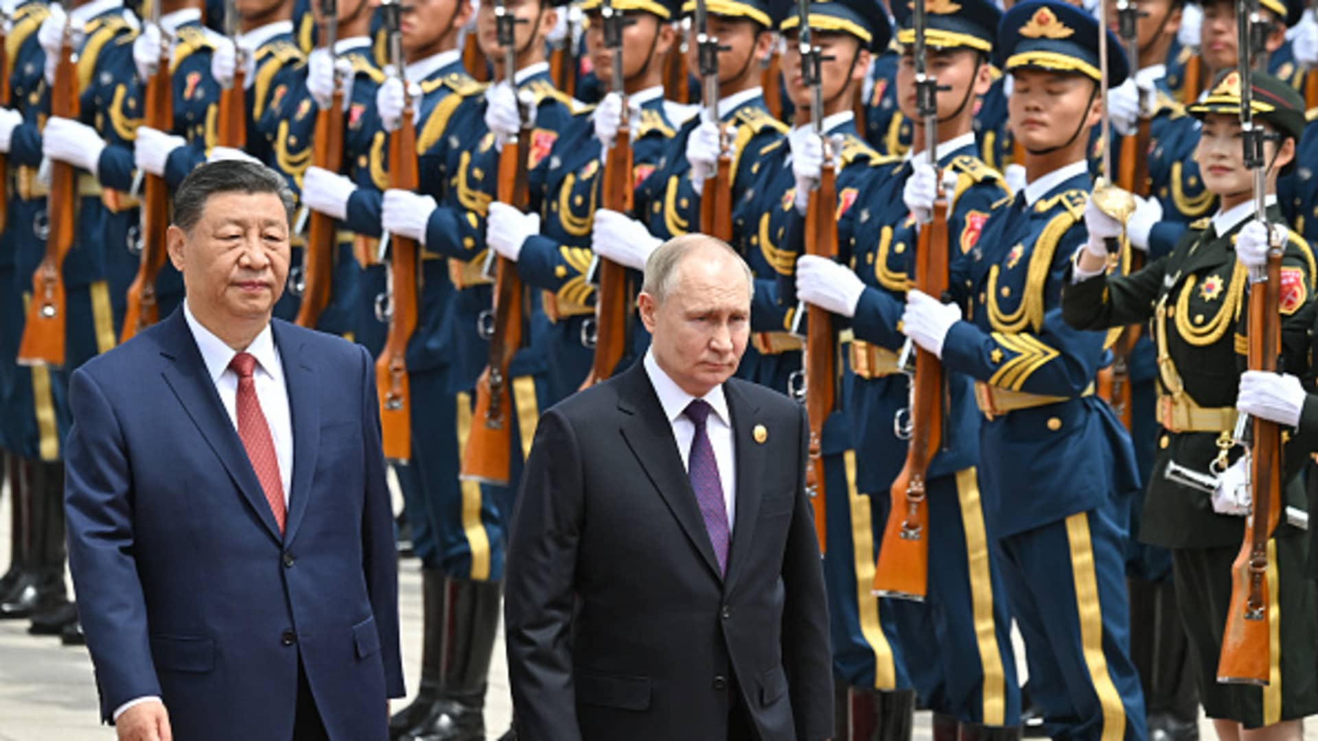 In this pool photograph distributed by the Russian state agency Sputnik, Russia’s President Vladimir Putin and China’s President Xi Jinping attend an official welcoming ceremony in front of the Great Hall of the People in Tiananmen Square in Beijing on May 16, 2024.