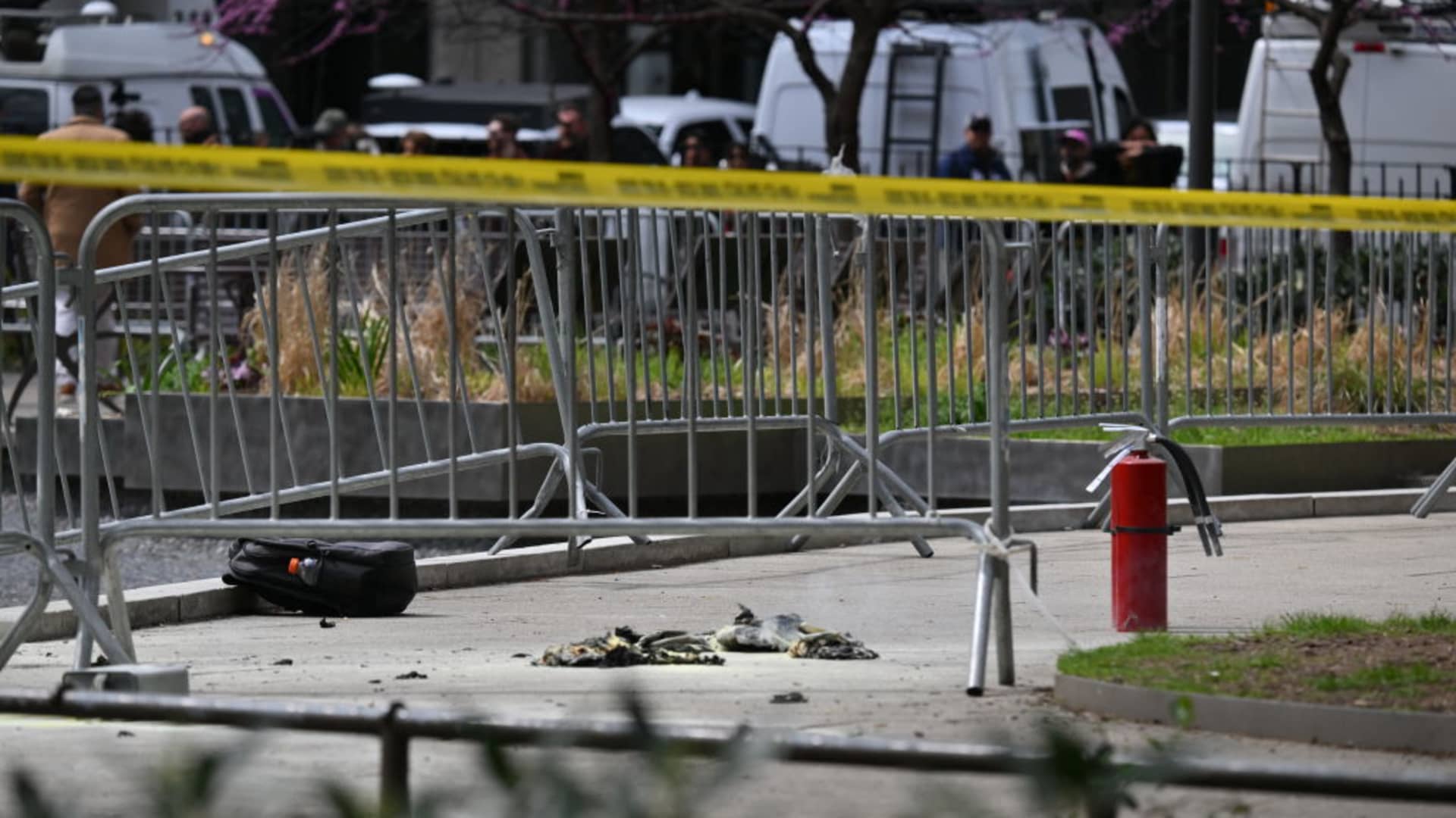 Fire extinguishers (R) are left at the park across from Manhattan Criminal Court in New York City after a man reportedly set himself on fire during the trial of former U.S. President Donald Trump, in New York City on April 19, 2024.