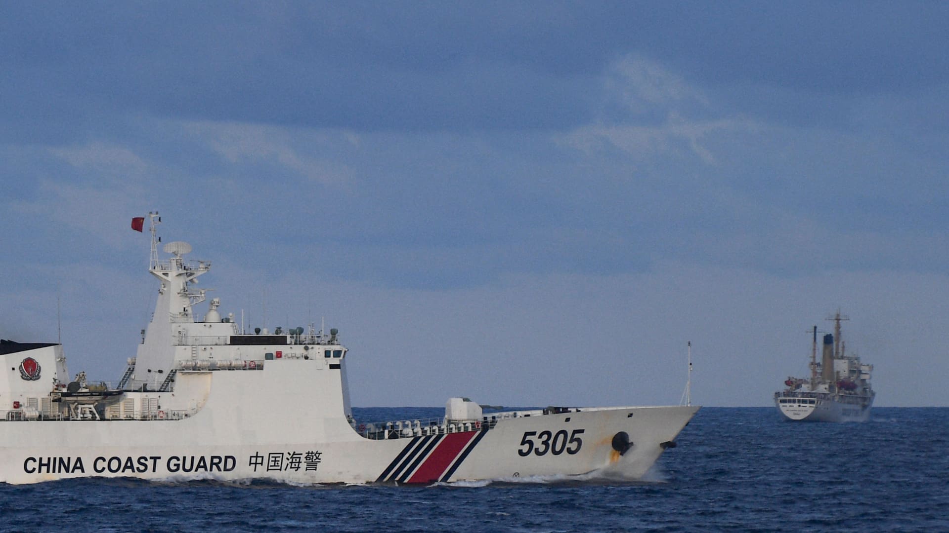 A Chinese Coast Guard ship sails near a Philippine vessel (R) that was part of a convoy of civilian boats in the disputed South China Sea on December 10, 2023. A convoy of civilian boats planning to deliver provisions to Filipino fishermen and troops in the disputed South China Sea aborted the trip on December 10 after “constant shadowing” by Chinese vessels, the organiser said.