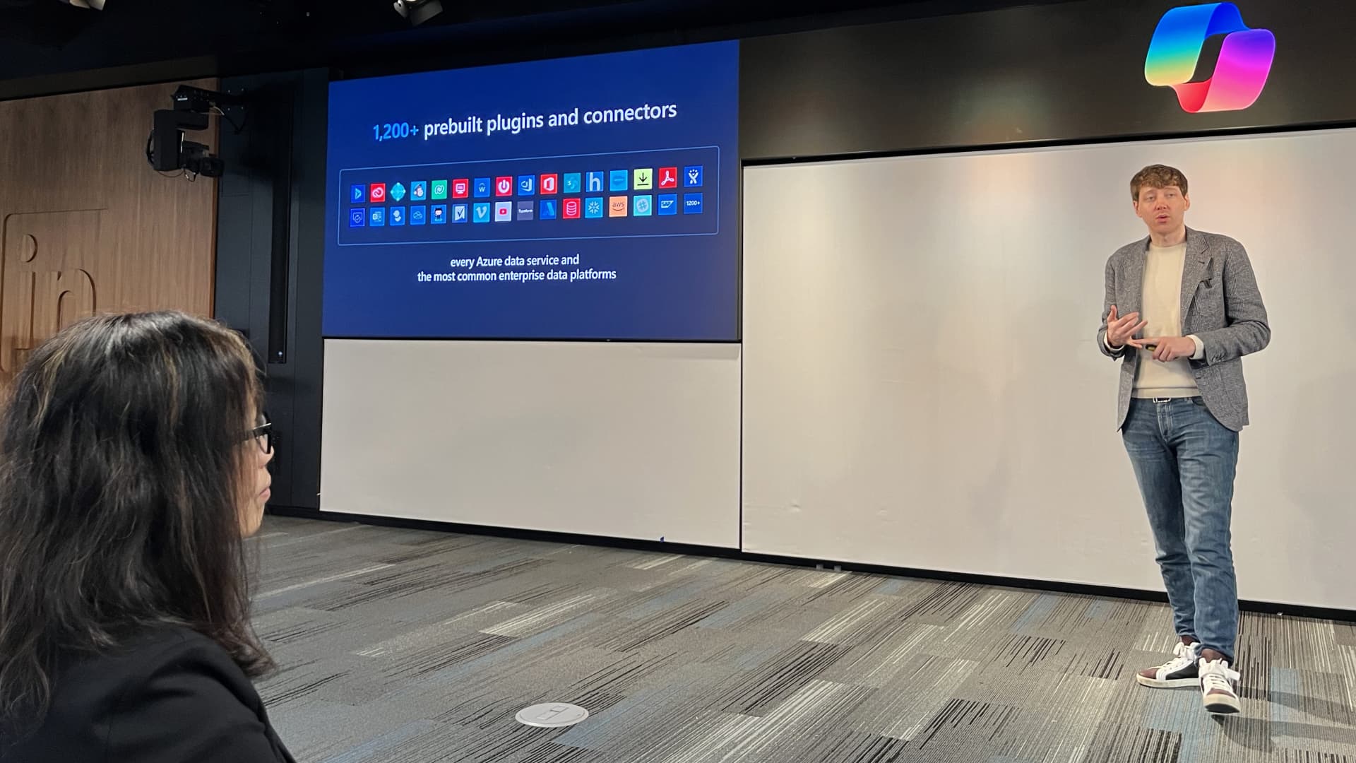 Charles Lamanna, corporate vice president for business applications and platforms at Microsoft, speaks at a press event in San Francisco on Feb. 28, 2024.