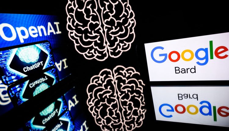 This photograph shows a screen displaying the logo of Bard AI, a conversational artificial intelligence software application developed by Google, and ChatGPT.
