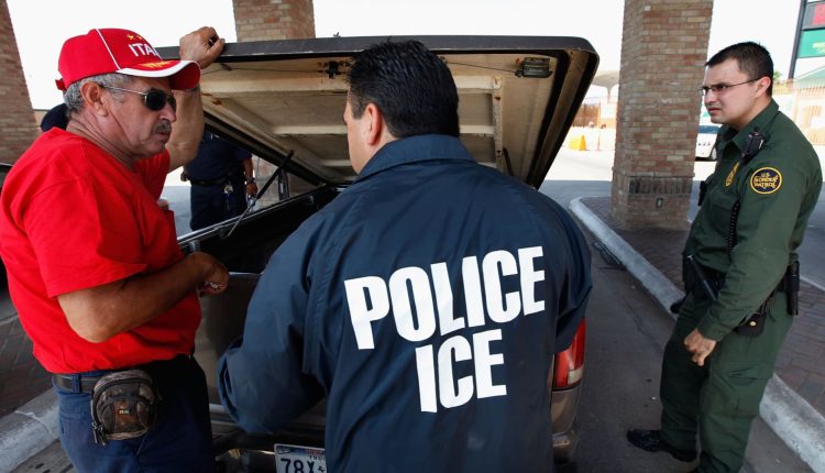Special agents from Immigration and Customs Enforcement (ICE) question a man while his vehicle is searched after he was stopped heading into Mexico at the Hidalgo border crossing.