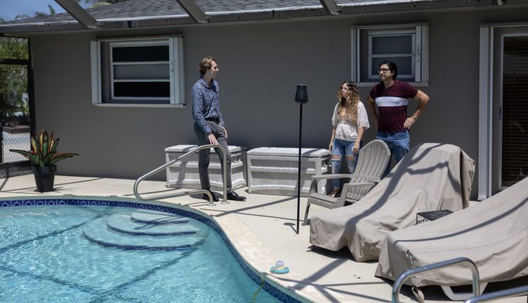 Ryan Ratliff (L), Real Estate Sales Associate with Re/Max Advance Realty, shows Ryan Paredes (R) and Ariadna Paredes a home for sale on April 20, 2023 in Cutler Bay, Florida.