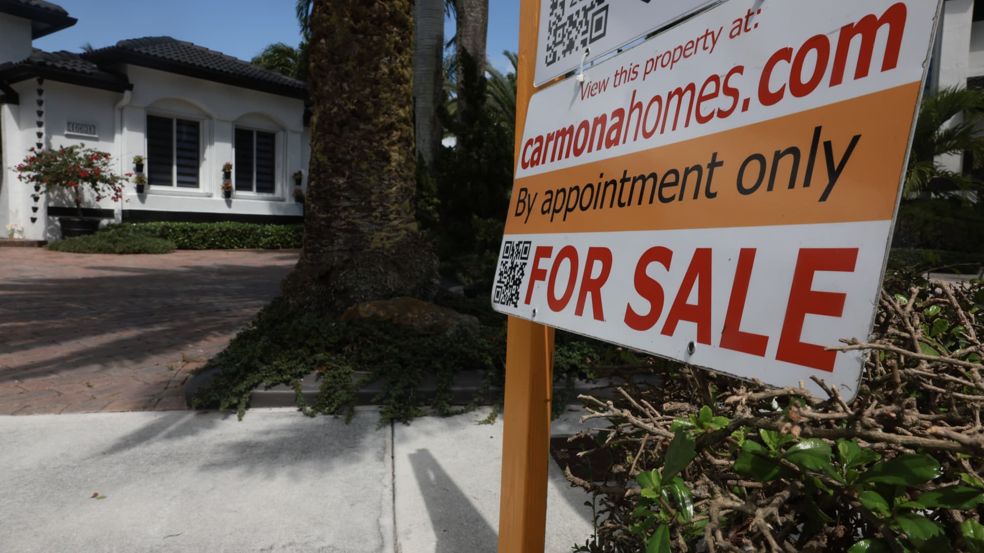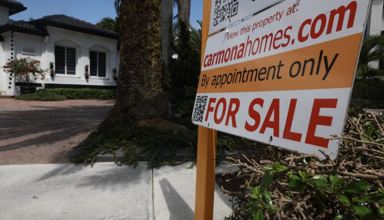 A ‘For Sale’ sign is posted on the lawn in front of a home on March 15, 2024, in Miami, Florida.