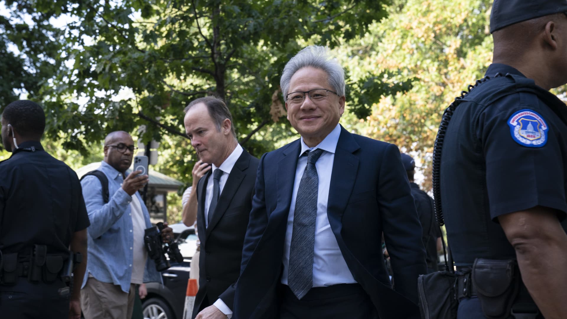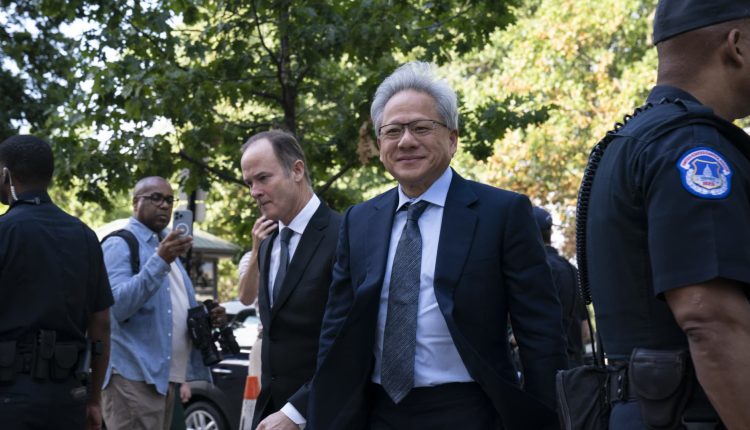 Nvidia Co-Founder and CEO Jensen Huang arrives at a Senate bipartisan Artificial Intelligence Insight Forum in Washington on Sept. 13, 2023.