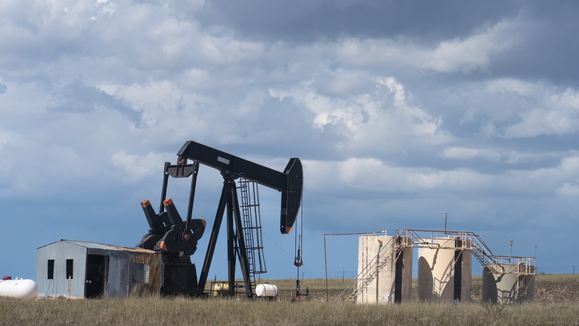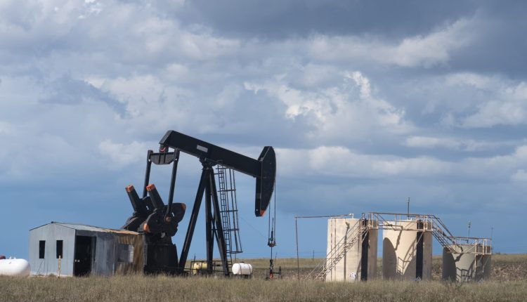An oil pump jack in Great Plains, southeastern Wyoming.