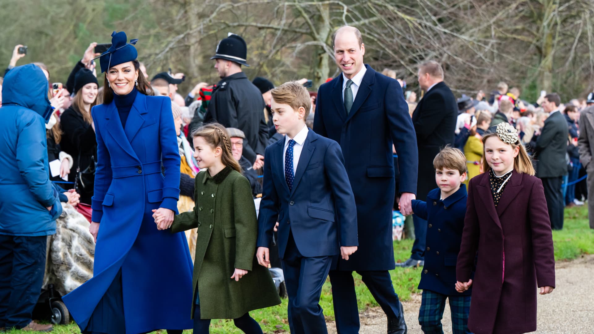 Catherine, Princess of Wales, Princess Charlotte of Wales, Prince George of Wales, Prince William, Prince of Wales, Prince Louis of Wales and Mia Tindall attend Christmas Morning Service at Sandringham Church on December 25, 2023 in Sandringham, Norfolk.