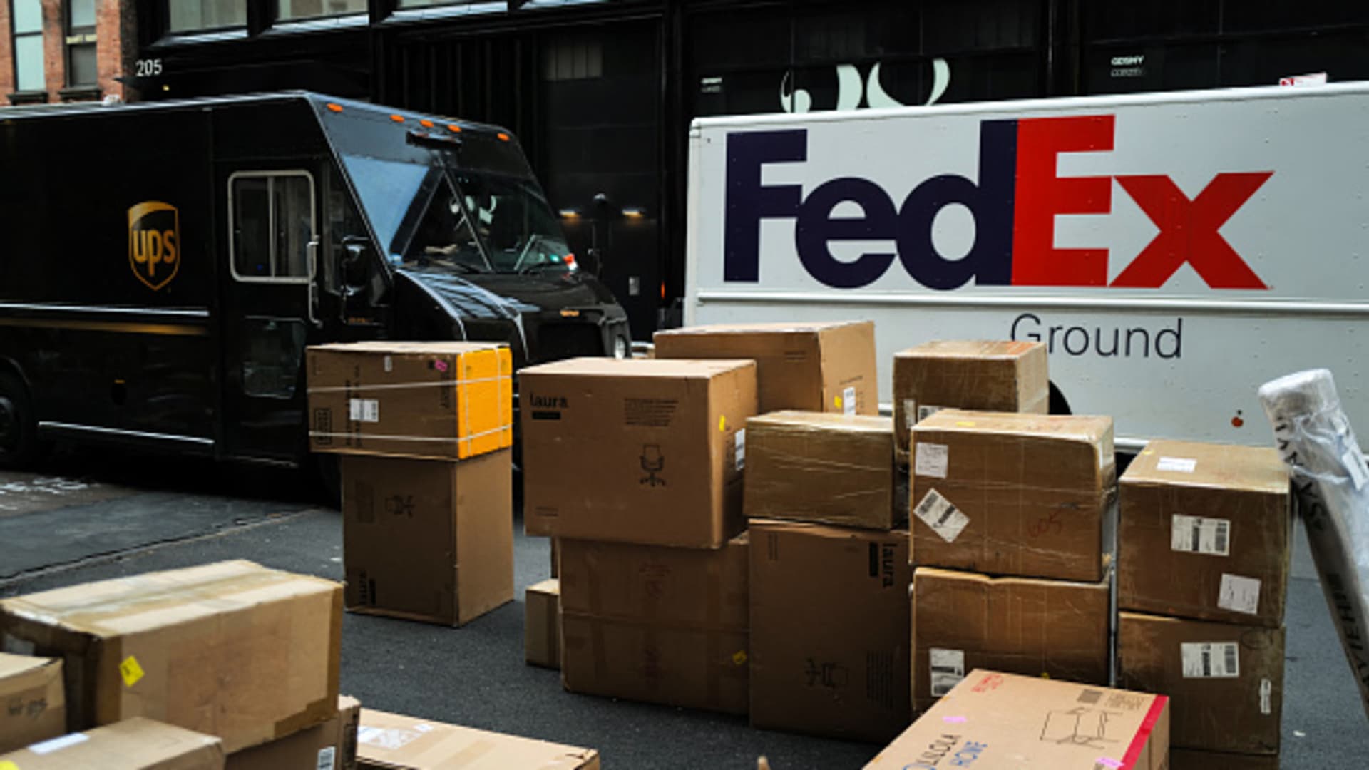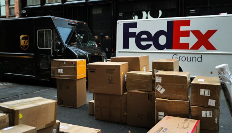 Parcels are seen in a street nearby UPS and FedEx trucks in a street of the Manhattan borough in New York City on December 4, 2023.