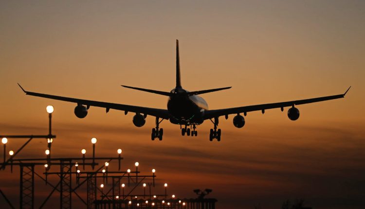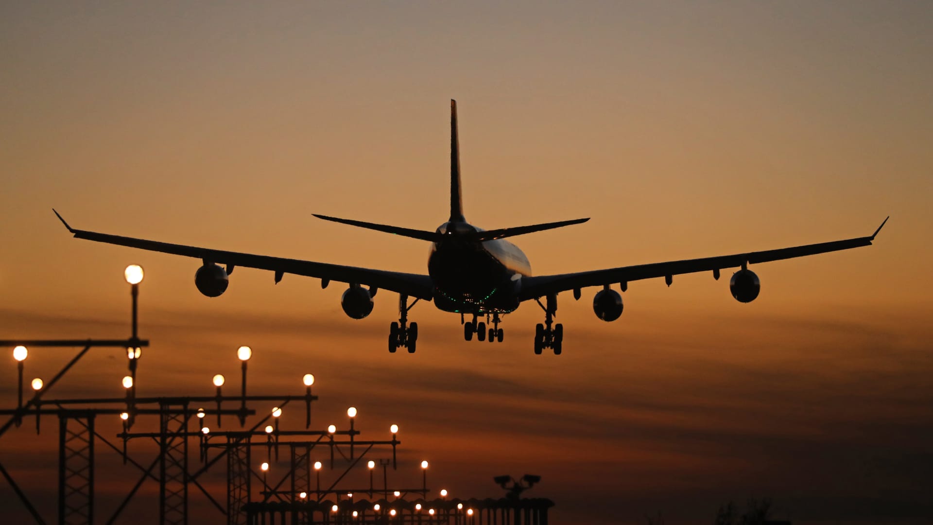 An Airbus A340-313, operated by Universal Sky Carrier is landing at night in Barcelona, Spain.