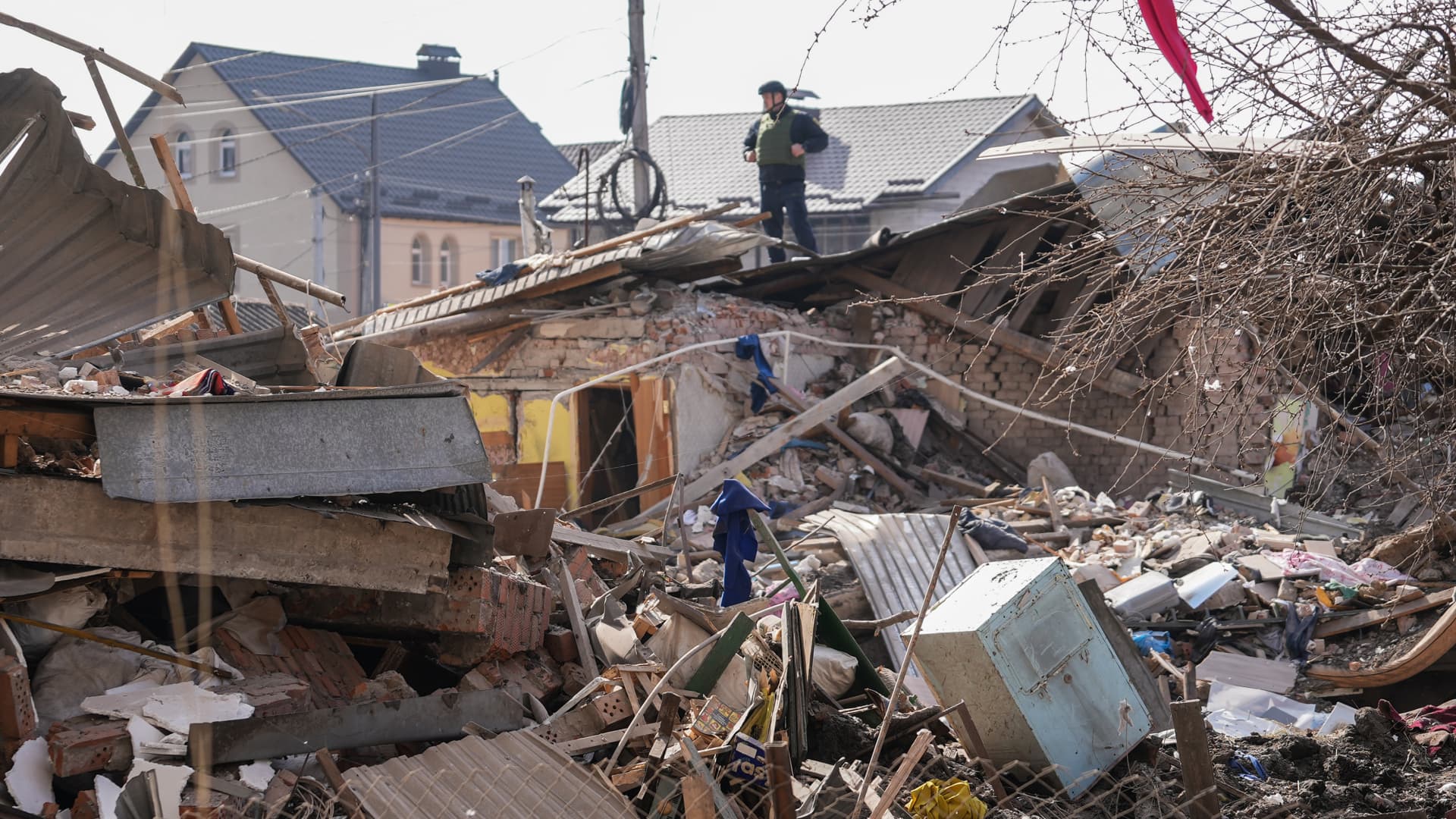 Rescuers respond at the site of a missile strike searching for people trapped under the rubble of a ruined private residential building on March 22, 2024 in Khmelnytskyi, Ukraine.