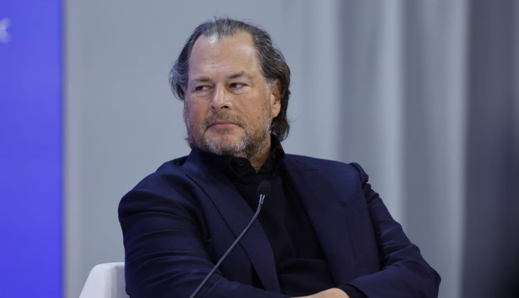 Marc Benioff, CEO of Salesforce, appears on a panel at the World Economic Forum in Davos, Switzerland, on Jan. 18, 2024.