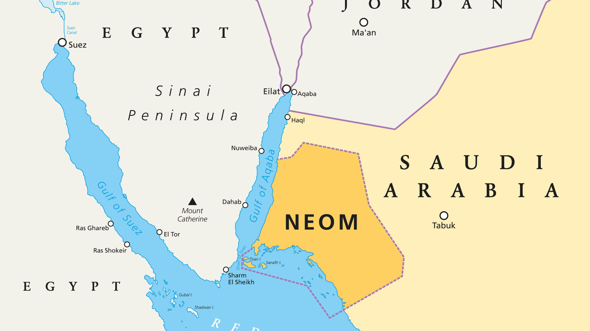 NEOM political map of the 500 billion dollar megacity project in Saudi Arabia along the Red Sea coast. Location of the smart and tourist city with autonomous judicial system. English labeling. Vector.