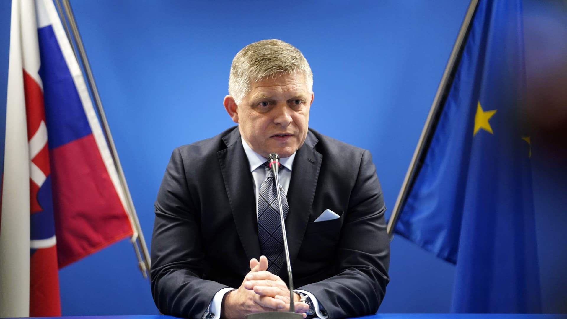Prime Minister of Slovakia Robert Fico attends a press conference during a Special European Council Meeting on April 18, 2024 in Brussels, Belgium.
