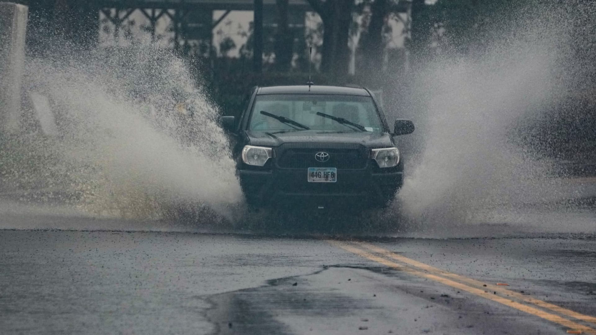 Vehicles move through a partially flooded street in Dunedin ahead of Hurricane Milton’s expected landfall tonight on October 9, 2024 in Florida.