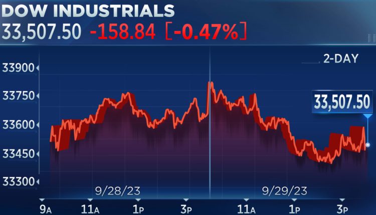 The Dow Jones Industrial Average retreated on Friday as investors followed the latest news about a potential government shutdown and ended what has been a tough month for stocks.
