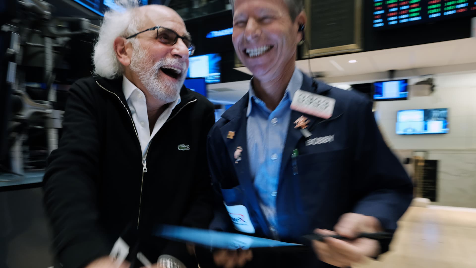 Stock trader Peter Tuchman, left, works on the floor of the New York Stock Exchange.