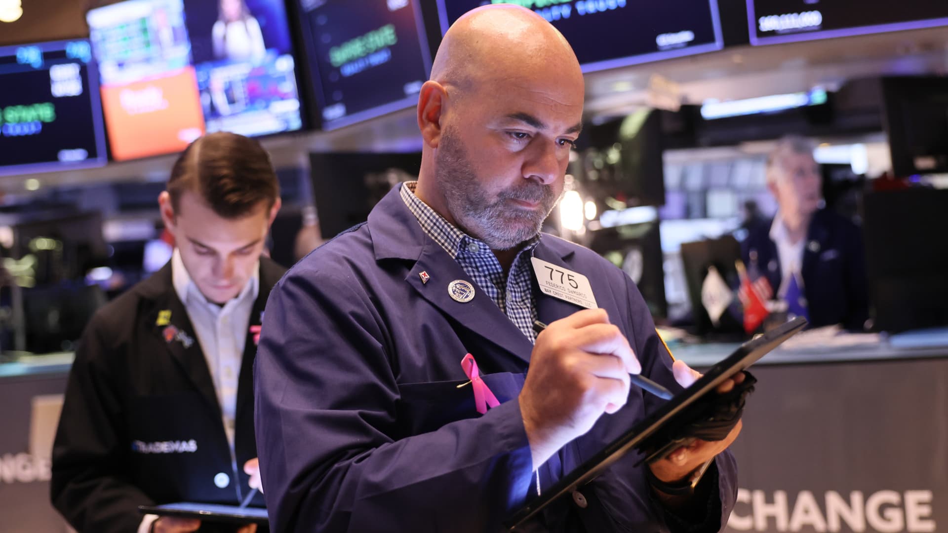Traders work on the floor of the New York Stock Exchange during morning trading on October 04, 2023 in New York City.
