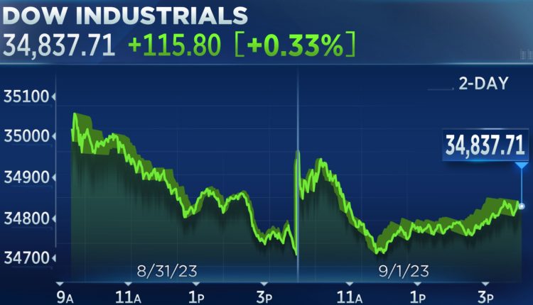 The Dow Jones Industrial Average rose on Friday as traders weighed the latest U.S. jobs report to conclude a winning week.