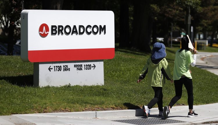 A sign is posted in front of a Broadcom office in San Jose, California, June 3, 2021.