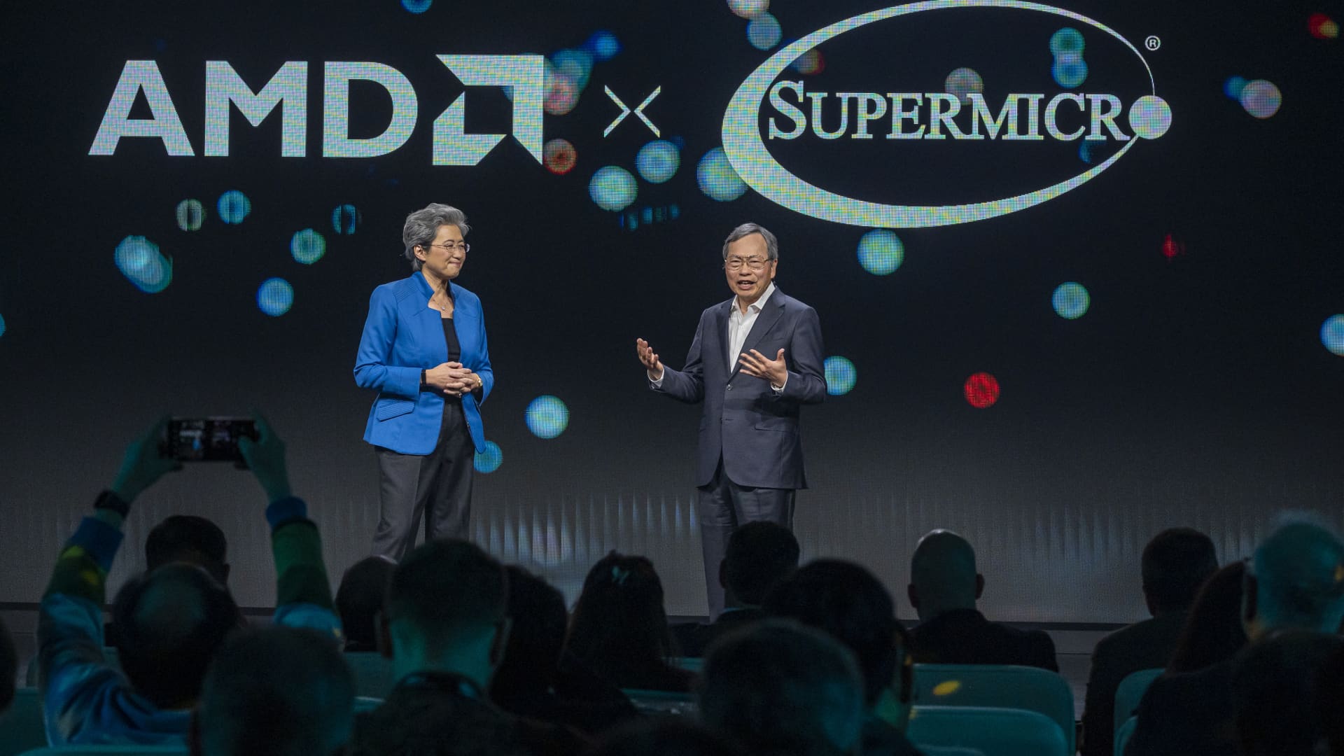 Lisa Su, chair and CEO of Advanced Micro Devices, left, and Charles Liang, CEO of Super Micro Computer, speak at the AMD Advancing AI event in San Jose, California, on Dec. 6, 2023.