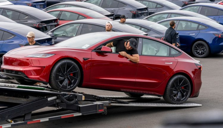 A worker unloads a new Tesla Model 3 from a truck at a logistics drop zone in Seattle, Washington, US, on Thursday, Aug. 22, 2024.