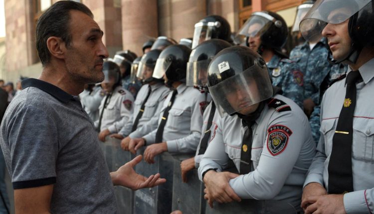 A protestor speaks with Armenian police officers as they guard the entrance to the Government House during a rally in Yerevan on September 21, 2023, following Azerbaijani military operations against Armenian separatist forces in Nagorno-Karabakh.
