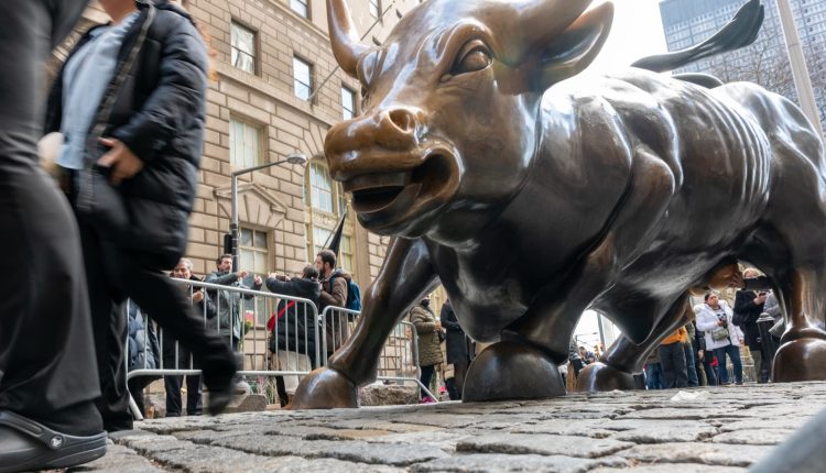 People walk through the Financial District by the New York Stock Exchange (NYSE) on the last day of trading for the year on December 29, 2023 in New York City.