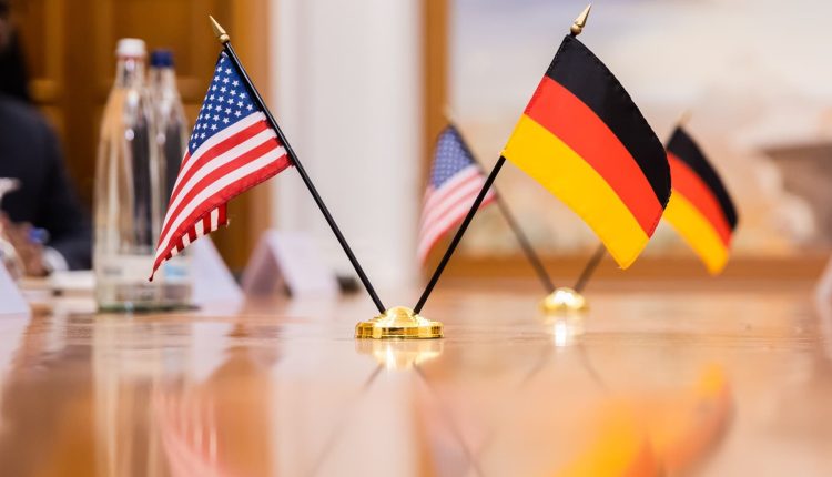 The flags of the U.S. and Germany are on the table at a bilateral meeting between German Economics Minister Habeck and U.S. Secretary of State Blinken at a hotel on the Gendarmenmarkt. Photo: Christoph Soeder/dpa (Photo by Christoph Soeder/picture alliance via Getty Images)