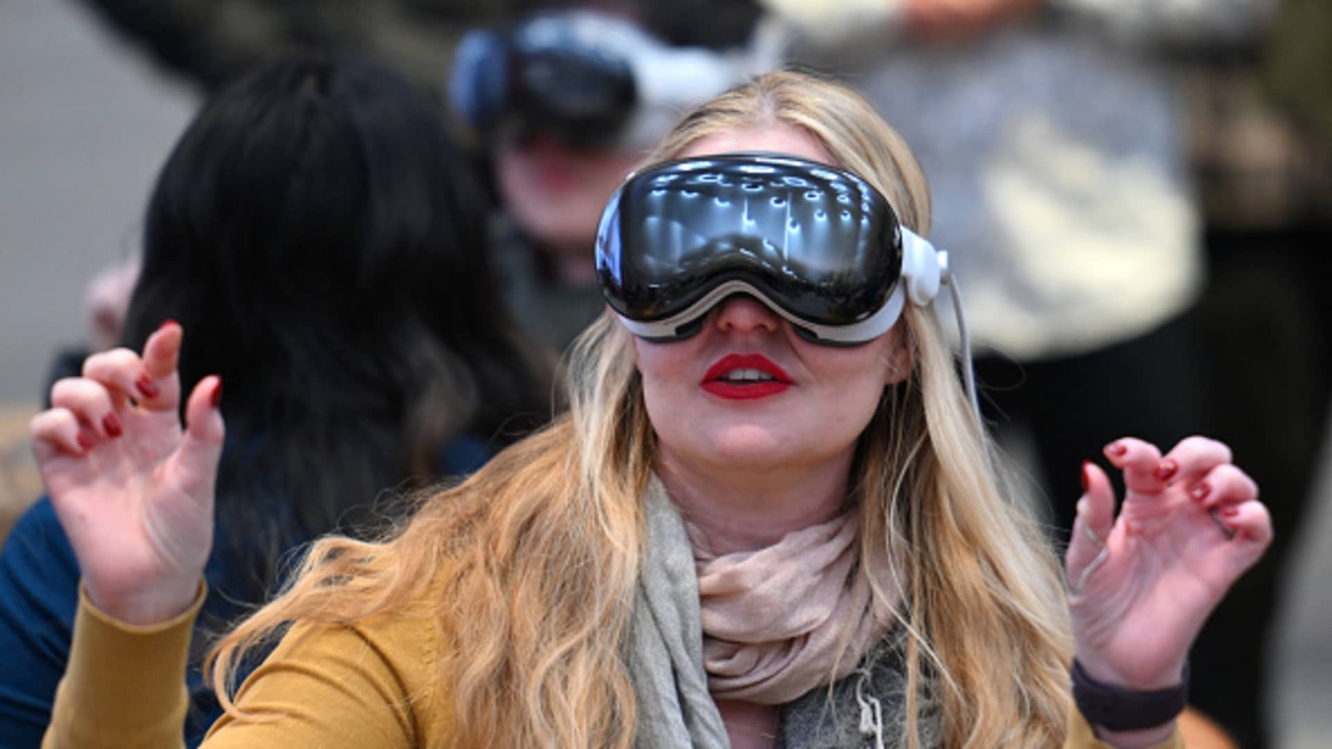 A customer tries on the Apple Vision Pro headset during the product launch at an Apple Store in New York City on Feb. 2, 2024.