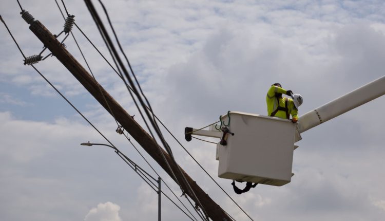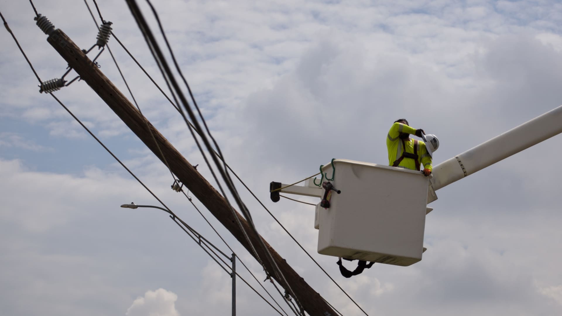 A CenterPoint foreign assistance crew worker wipes sweat from his brow as he works with others to restore power lines on July 11, 2024 in Houston, Texas.
