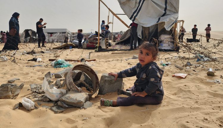 A Palestinian child plays with the rubble after Israel bombs Palestinians’ tents and shelters in Rafah, Gaza on May 27, 2024. Israeli aircrafts bombed tents of displaced Palestinians living near the United Nations Relief and Works Agency for Palestine Refugees (UNRWA) warehouses of Rafah and killed at least 30 Palestinians including children according to Gaza media office.