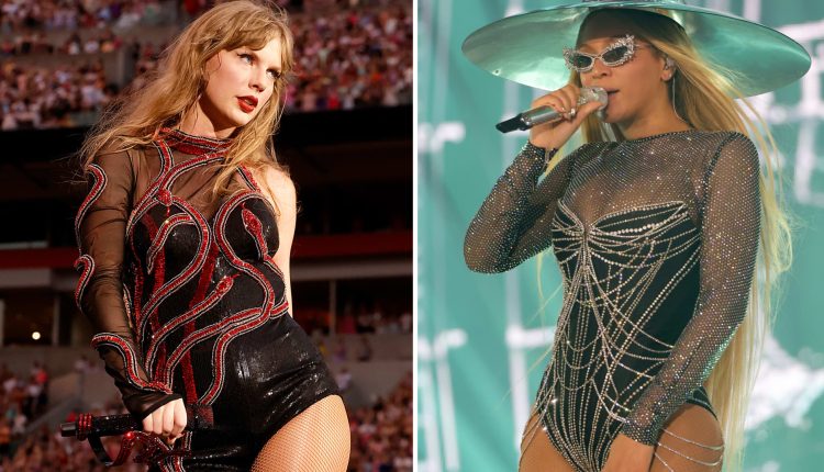 (L) Taylor Swift performs onstage during her The Eras Tour at Paycor Stadium in Cincinnati, Ohio, on June 30, 2023. (R) Beyoncé performs onstage during her Renaissance World Tour at the Johan Cruyff Arena in Amsterdam, Netherlands, on June 17, 2023.