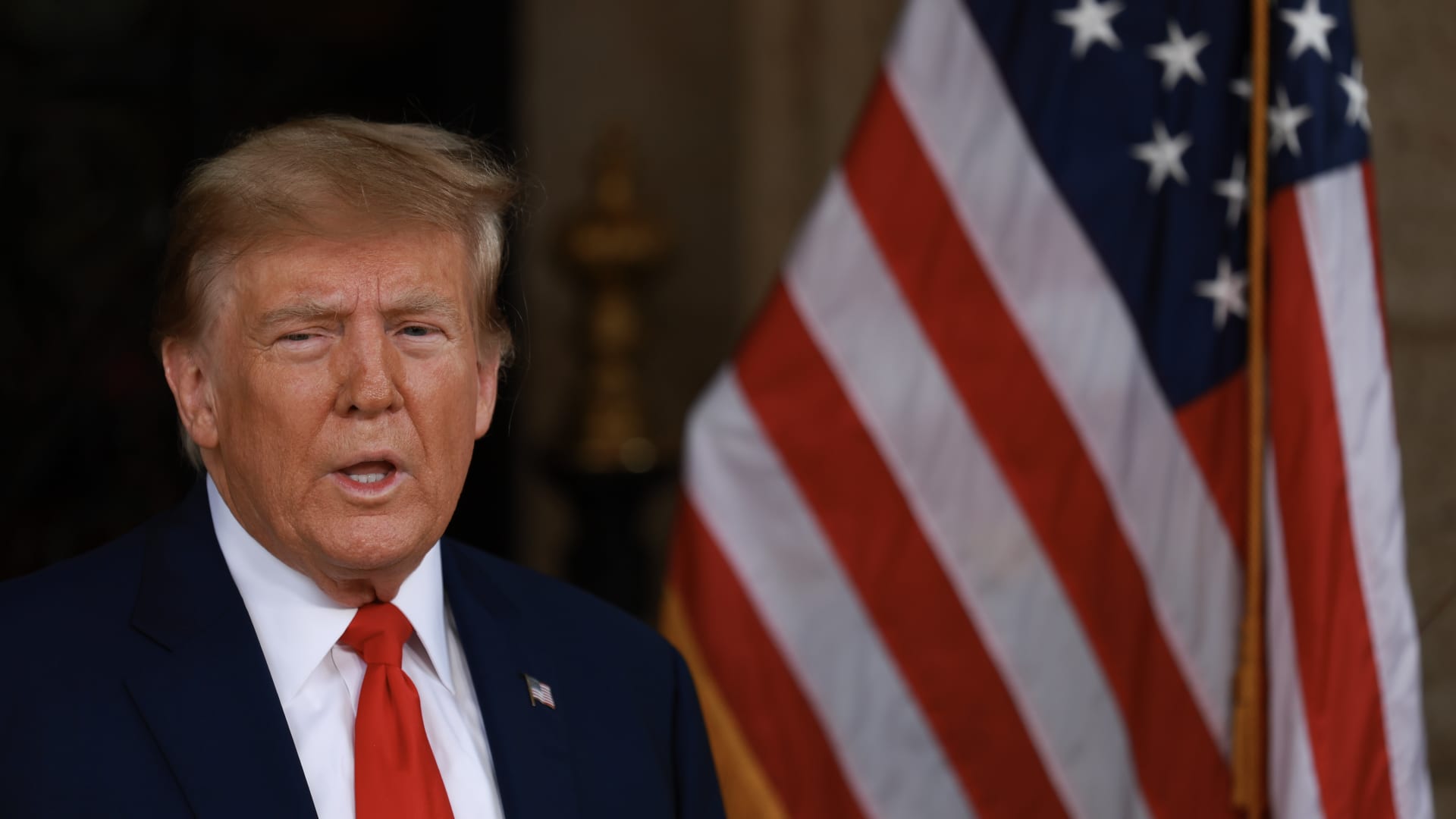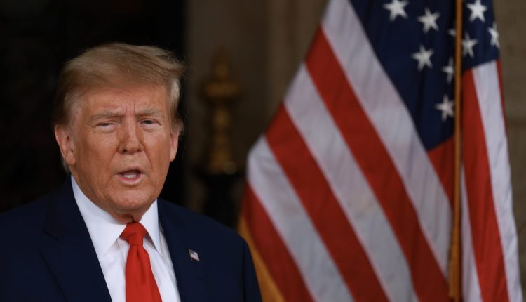 Former U.S. President Donald Trump speaks during a press conference held at Mar-a-Lago on February 08, 2024 in Palm Beach, Florida.