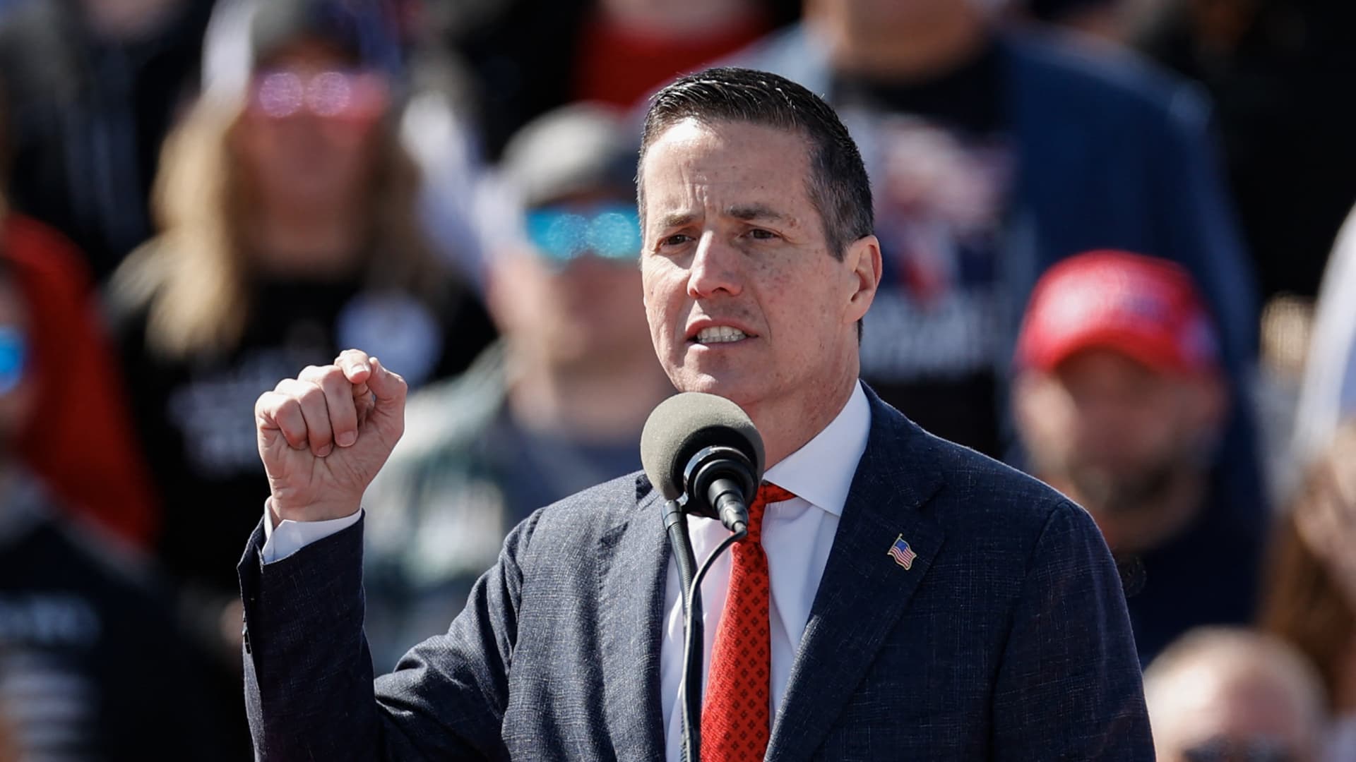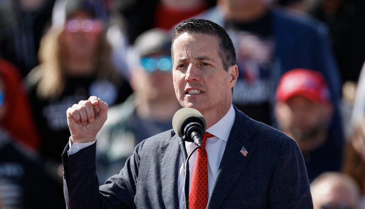 US Senate candidate Bernie Moreno, Republican of Ohio, speaks before former US President and Republican presidential candidate Donald Trump takes the stage during a Buckeye Values PAC Rally in Vandalia, Ohio, on March 16, 2024.