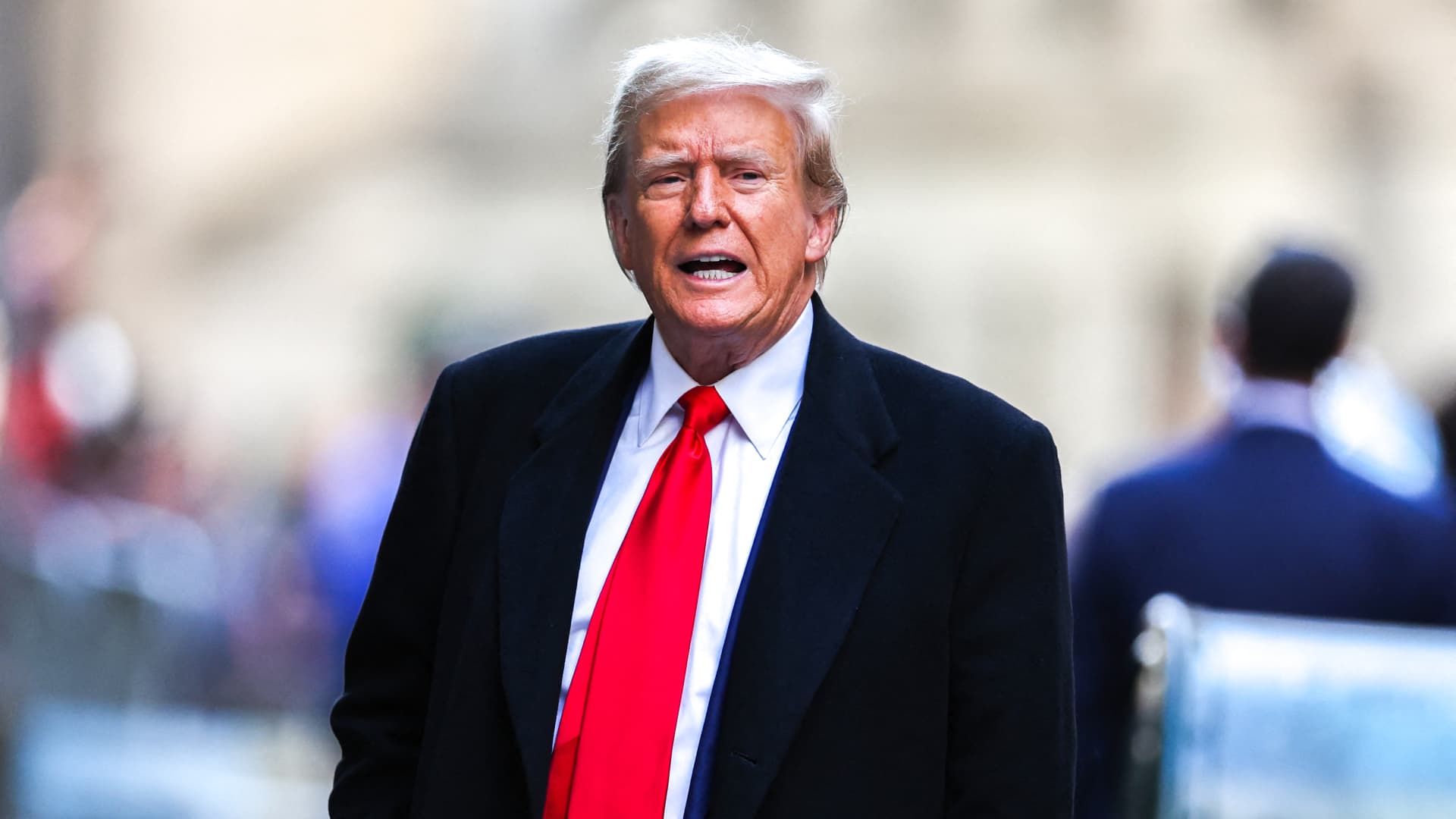 Former US President Donald Trump arrives at 40 Wall Street after his court hearing to determine the date of his trial for allegedly covering up hush money payments linked to extramarital affairs in New York City on March 25, 2024.