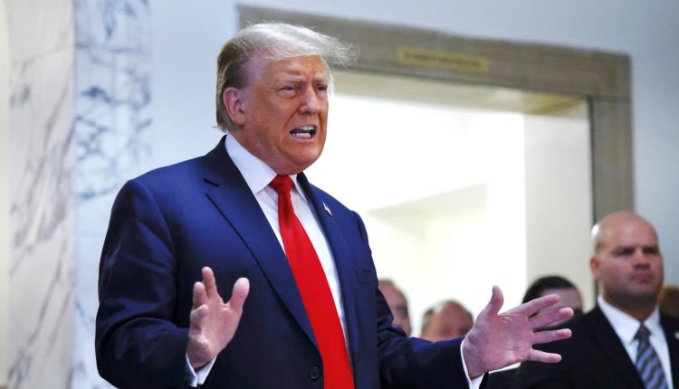 Former President Donald Trump speaks to members of the media while arriving for the second day of his civil fraud trial in New York on Oct. 3, 2023.