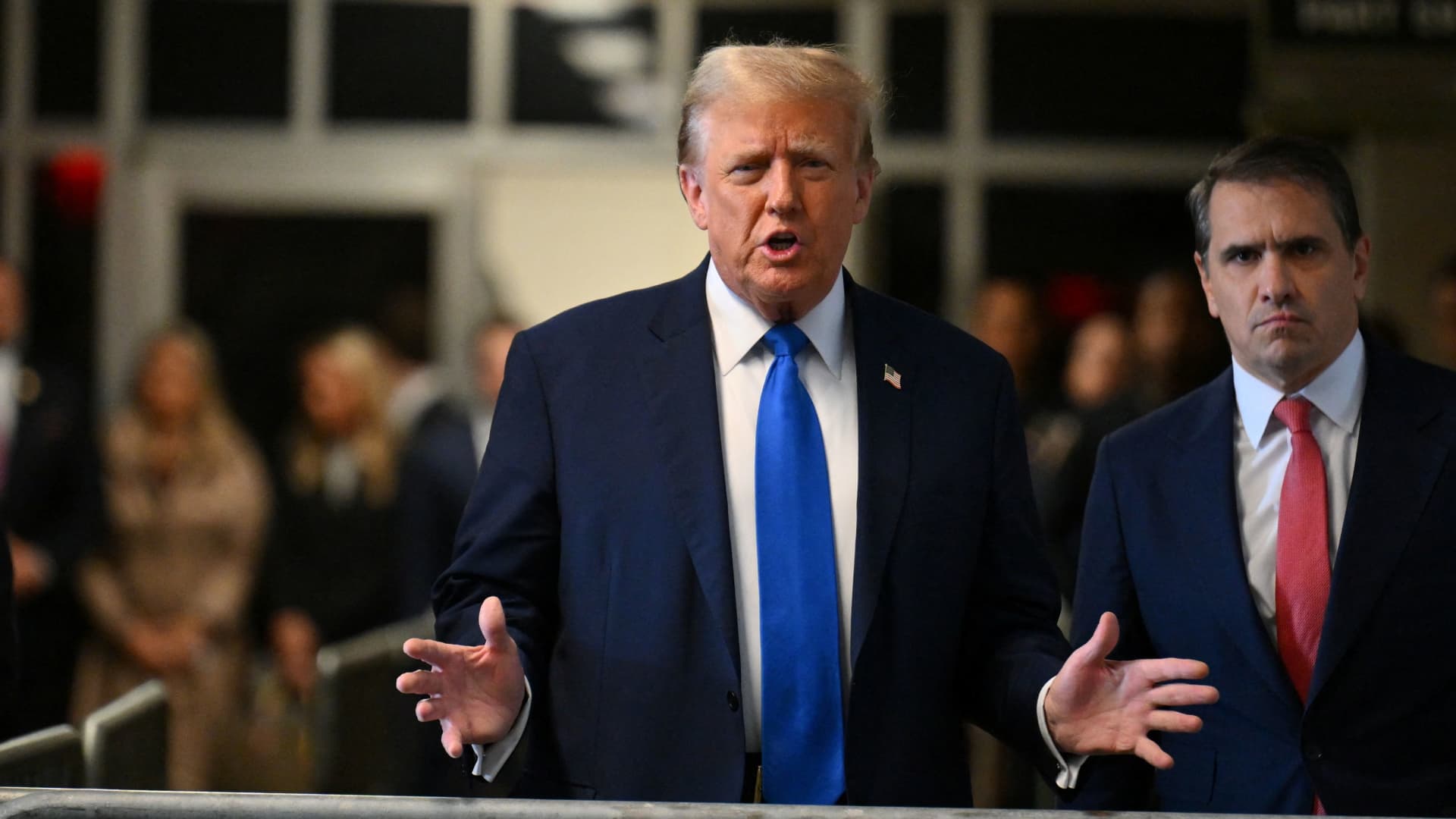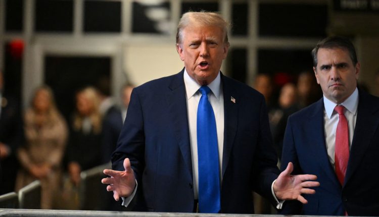 Former U.S. president and Republican presidential candidate Donald Trump arrives at Manhattan Criminal Court to attend his trial for allegedly covering up hush money payments linked to extramarital affairs in New York, on April 22, 2024.