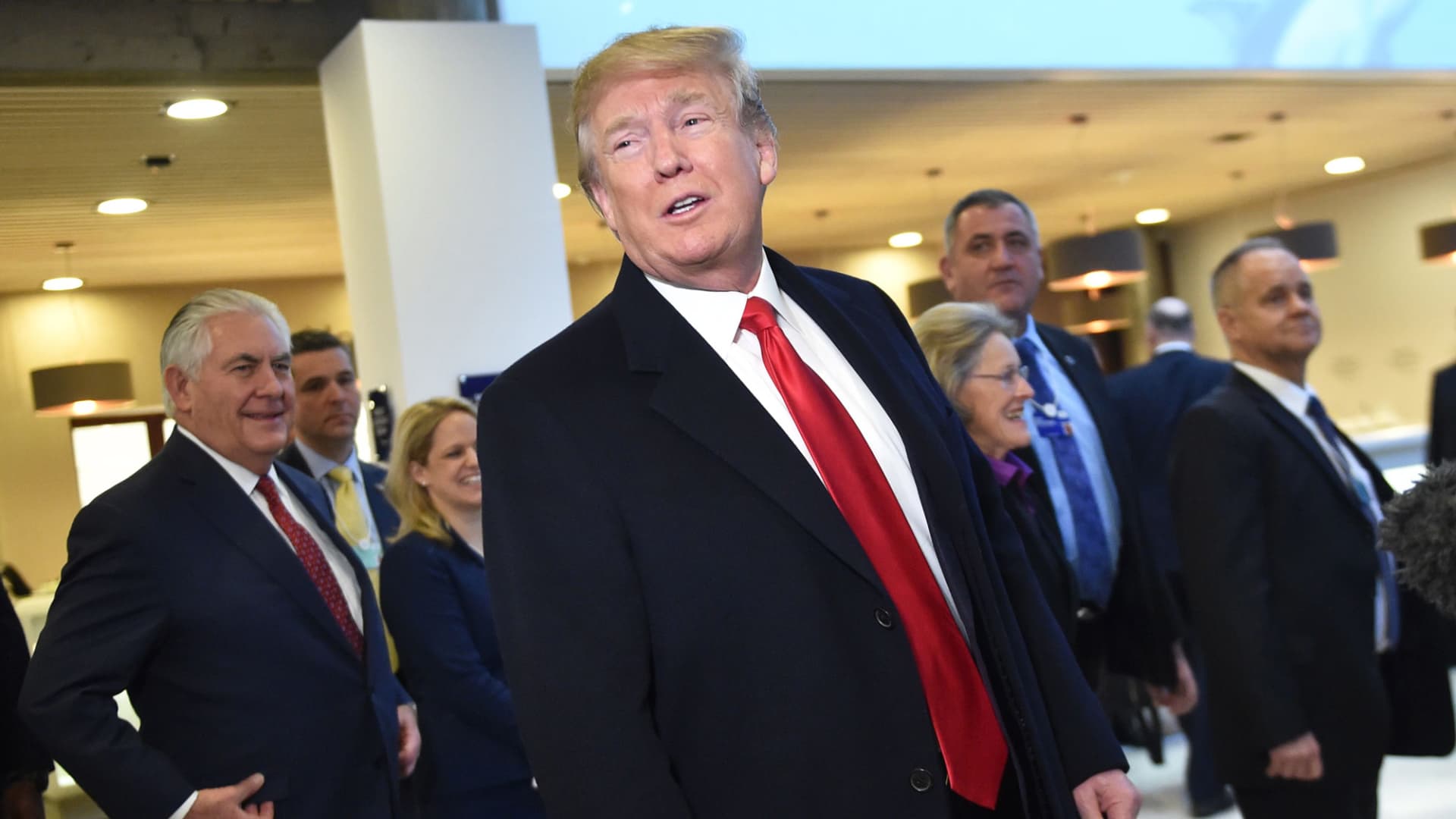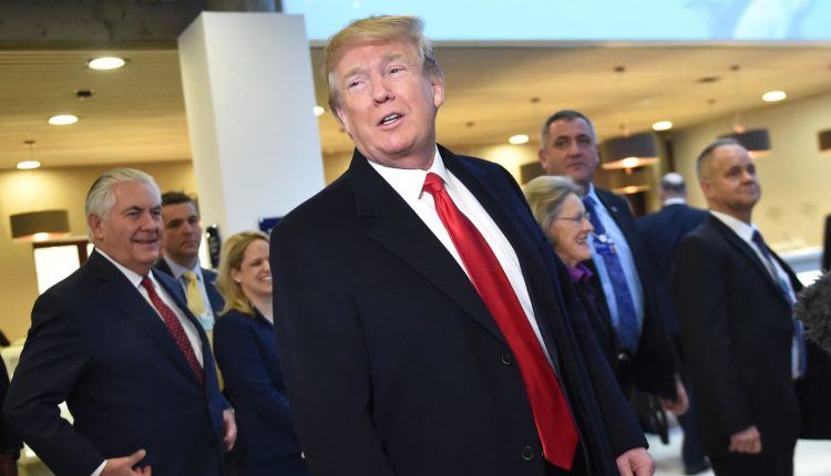 President Donald Trump (C) arrives, flanked by US Secretary of State Rex Tillerson (L), to address the World Economic Forum (WEF) annual meeting on January 26, 2018 in Davos, Switzerland.